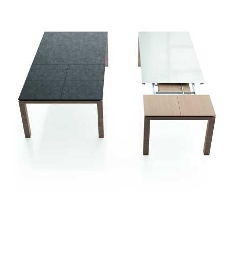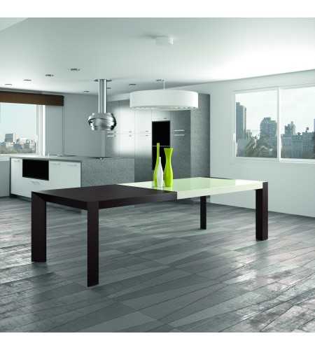 Table rectangulaire extensible avec allonges incorporées. Personnalisable : plateau bois, verre et céramique. Bois teinté et laqués 40 finitions.