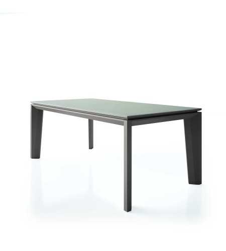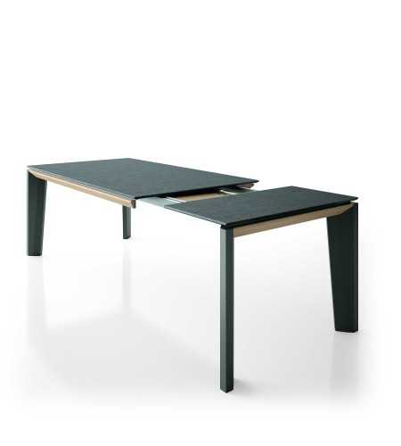 Table extensible rectangulaire avec plateau céramique, 2 allonges incorporées et pied central