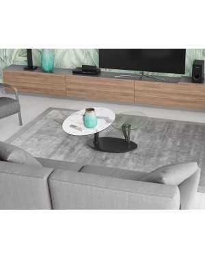 La table Ovalia est une table basse résolument contemporaine. Elle dispose de deux plateaux ovales qui pivotent de manière synchonisée. Le plateau supérieur est toujours en céramique collée sur verre. Le plateau inférieur en verre trempé de 10mm. Sa base est en acier laqué noir. Découvrez la nouvelle finition Silver sur la table basse Ovalia, une belle alliance d’utile et d’agréable.