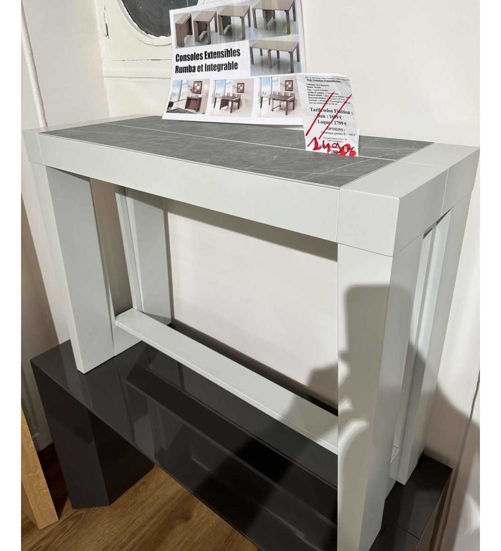 La Rumba est une console extensible avec allonges incorporées au design affiné et avec au choix la possibilité d'avoir un plateau en Céramique dans différents coloris.